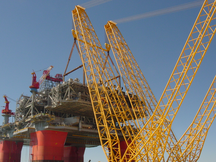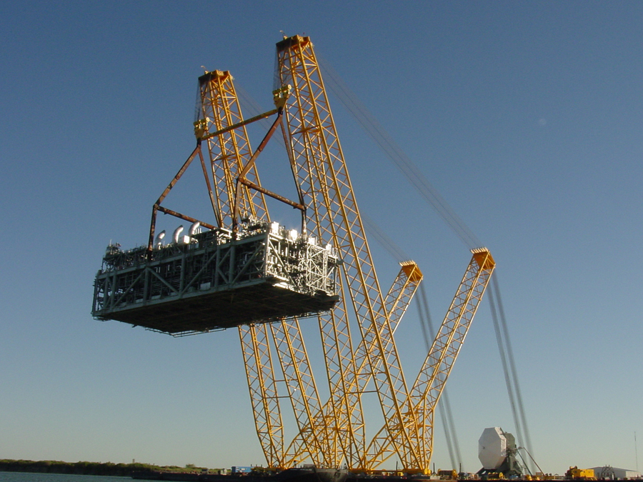 | Offshore Vessel Construction And Assembly Timberland supplied all the hoisting equipment for the world’s largest land-based heavy lift device at the Kiewit facility in Corpus Christi, Texas, USA. Its hoists, reel winders, hydraulic power units and control system are all synchronized to ensure that the booms remain evenly loaded over lengths of rope exceeding 10,000 ft. (3000 m) under strict safety guidelines. The system is an essential component in the final assembly of offshore oil and gas platforms.